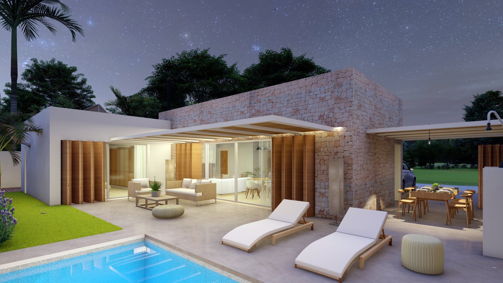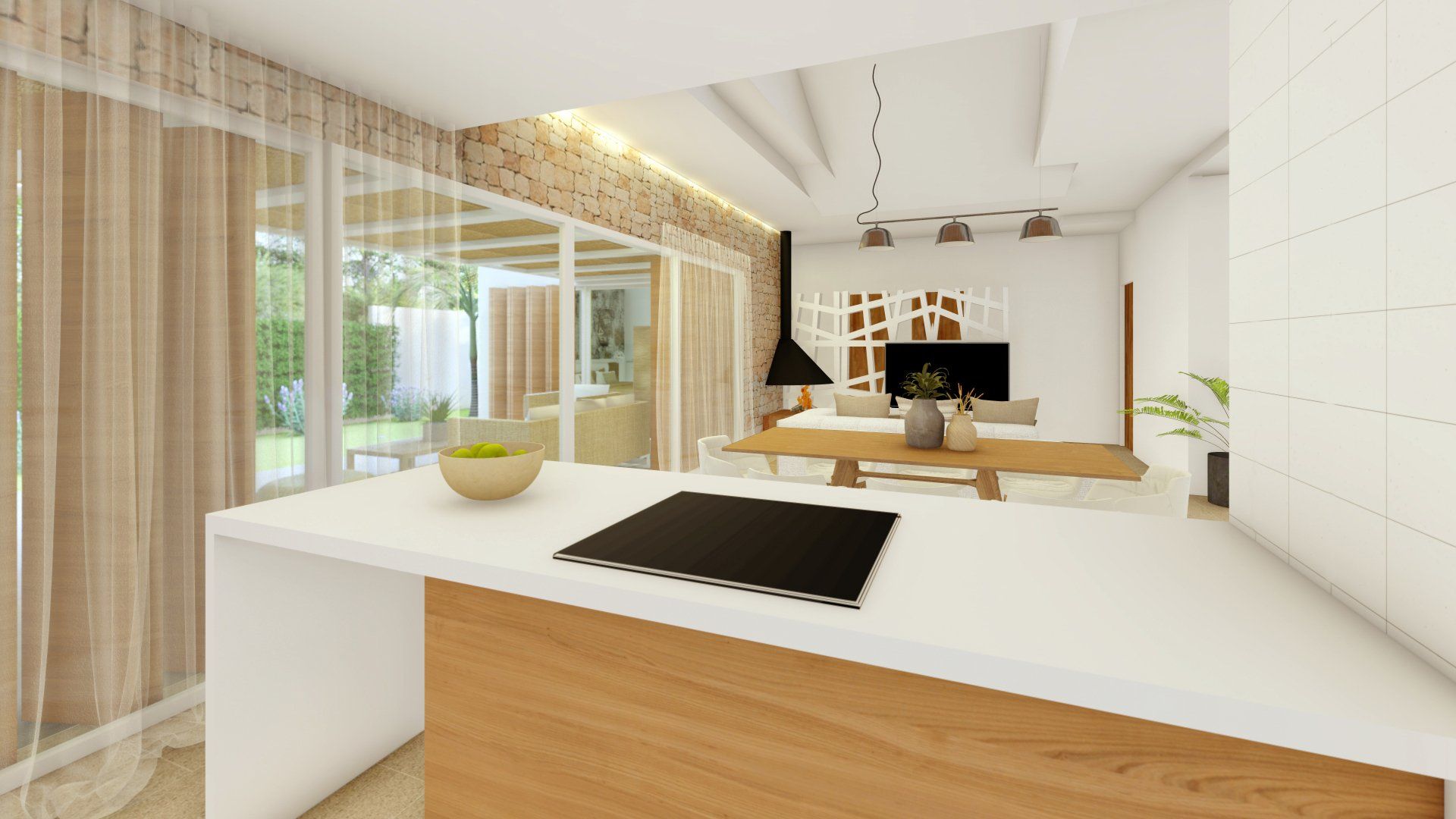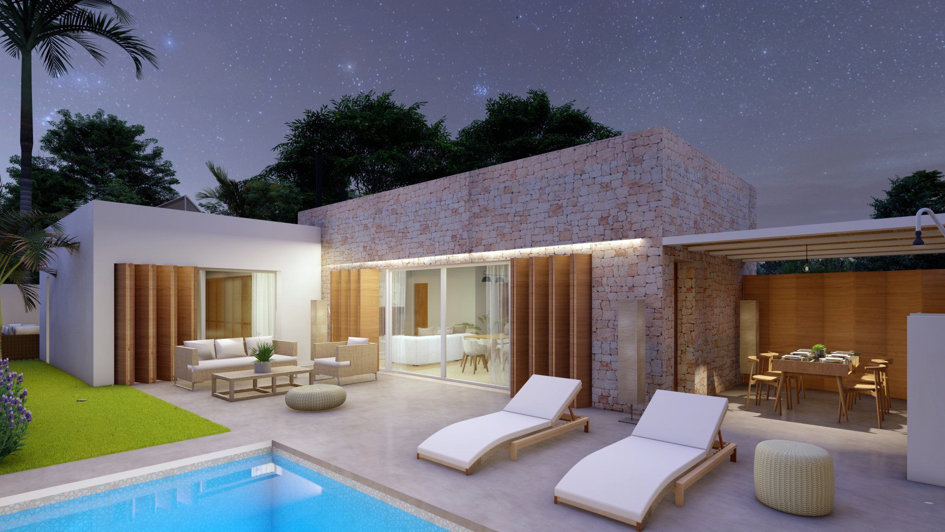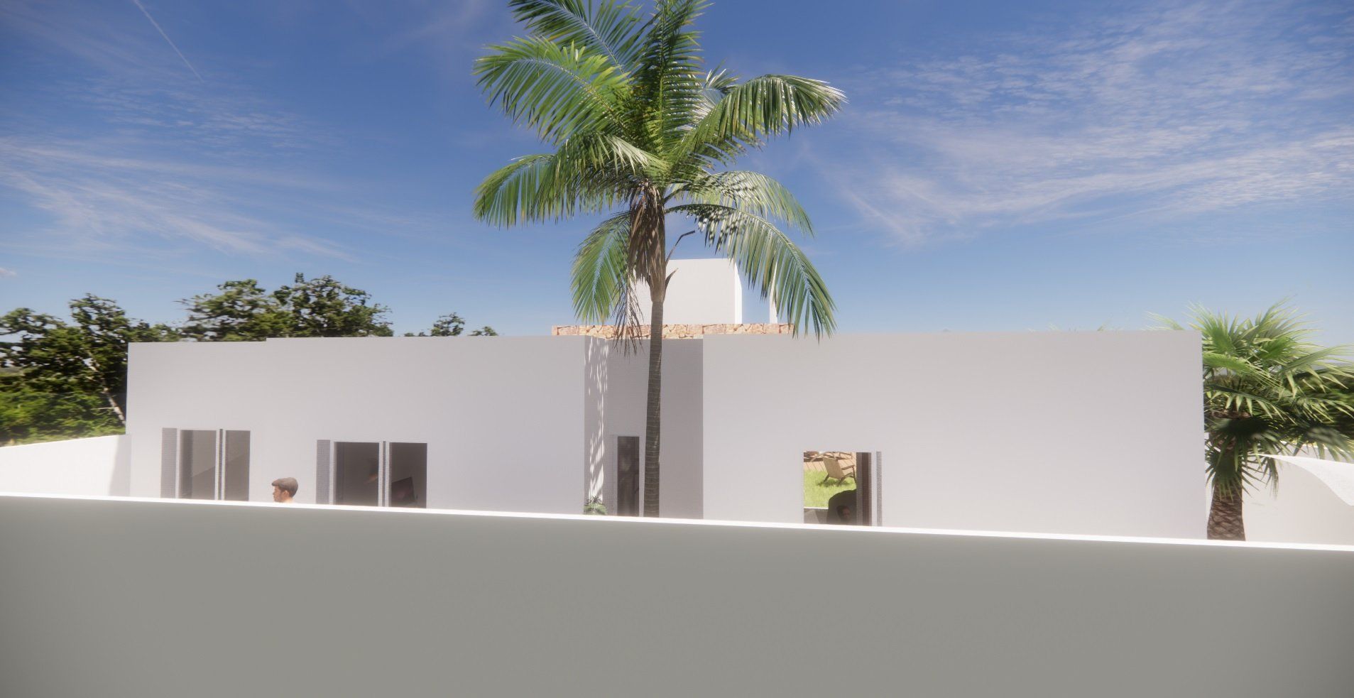 Einfamilienhausprojekt in der Urbanisation Montgó Village in La Pedrera de Denia. Es geht darum, den ibizenkischen Stil zu aktualisieren, ohne seine Essenz in Farben, Formen und Kompositionen einer Pflanze zu verlieren