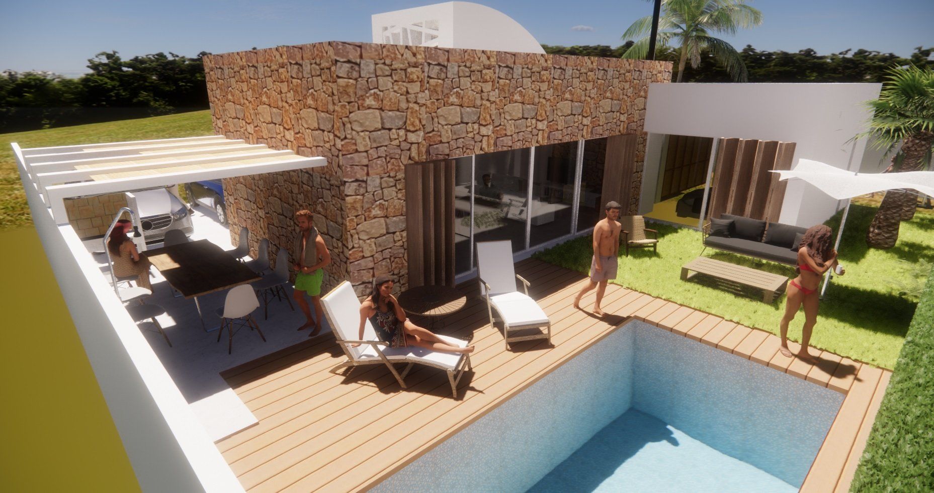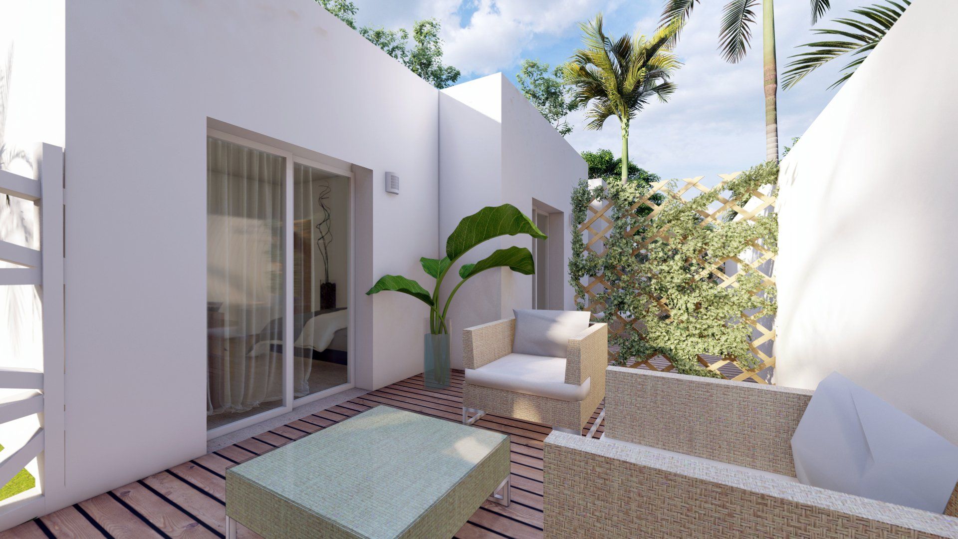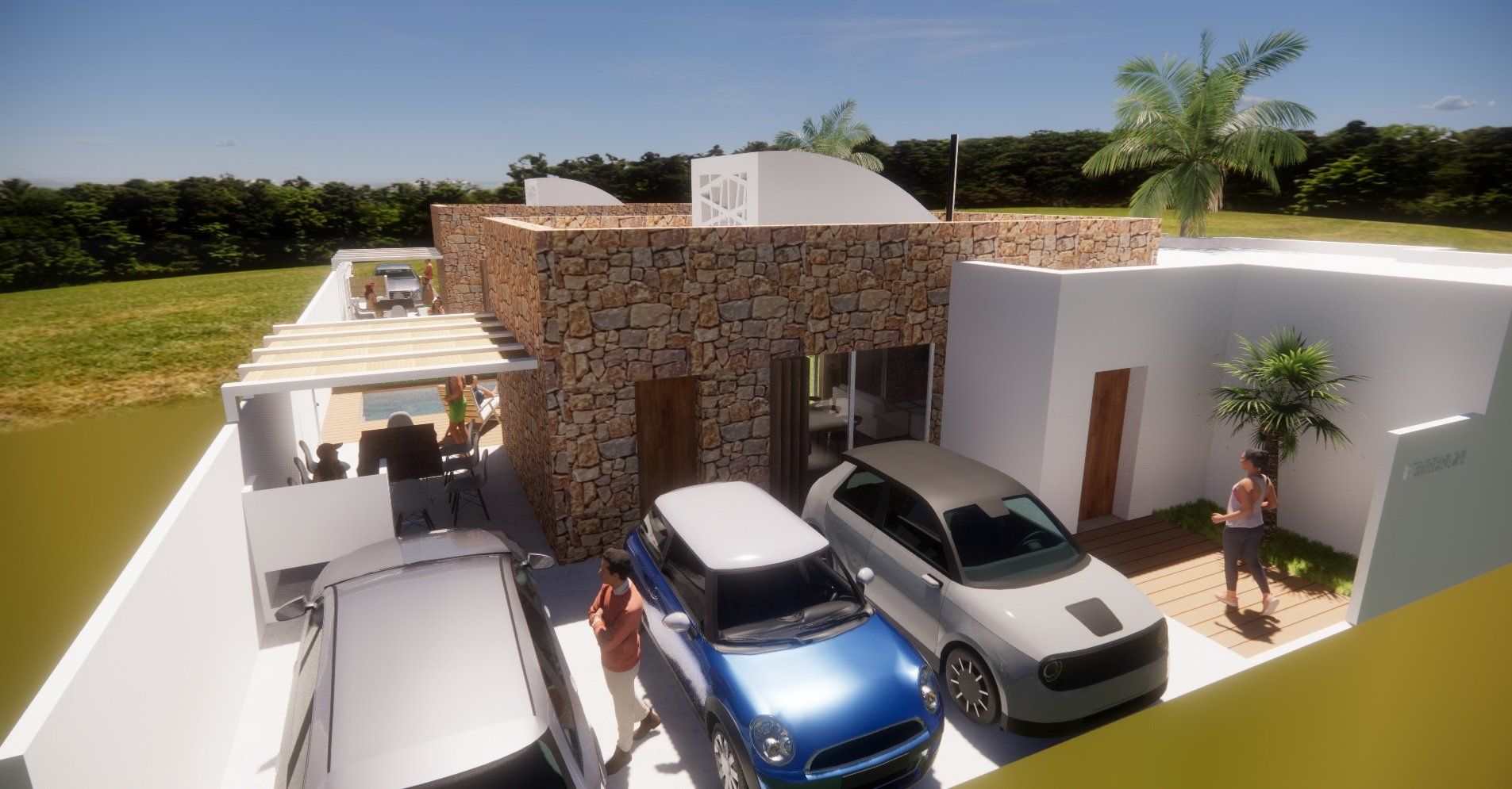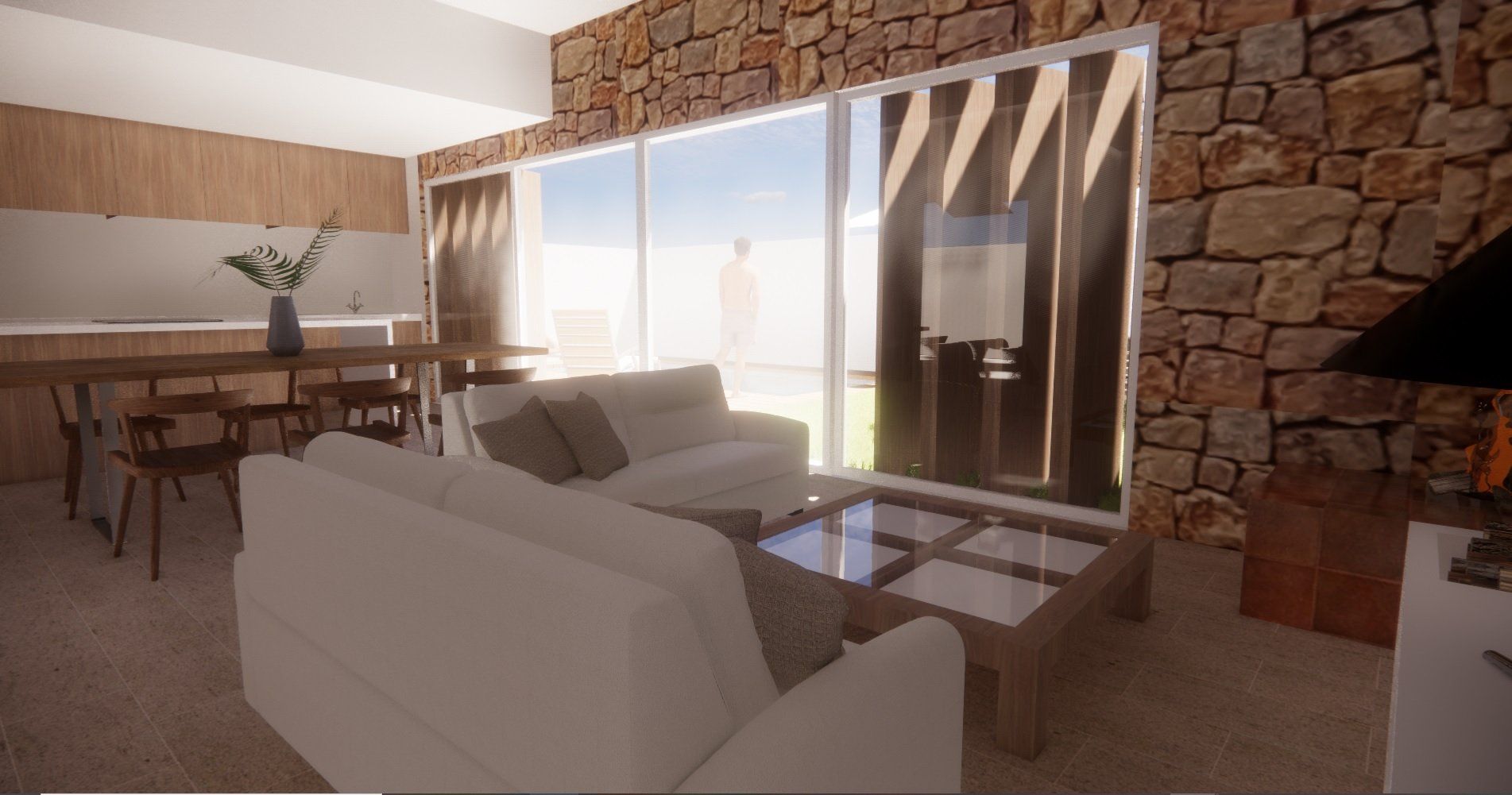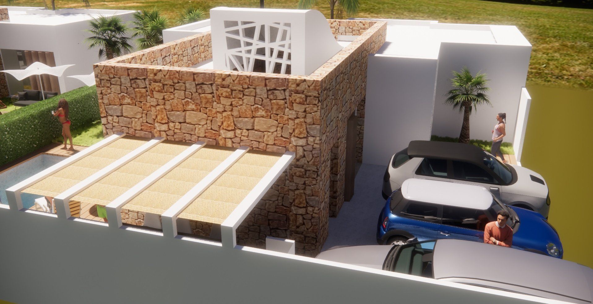 Einfamilienhausprojekt in der Urbanisation Montgó Village in La Pedrera de Denia. Es geht darum, den ibizenkischen Stil zu aktualisieren, ohne seine Essenz in Farben, Formen und Kompositionen einer Pflanze zu verlieren